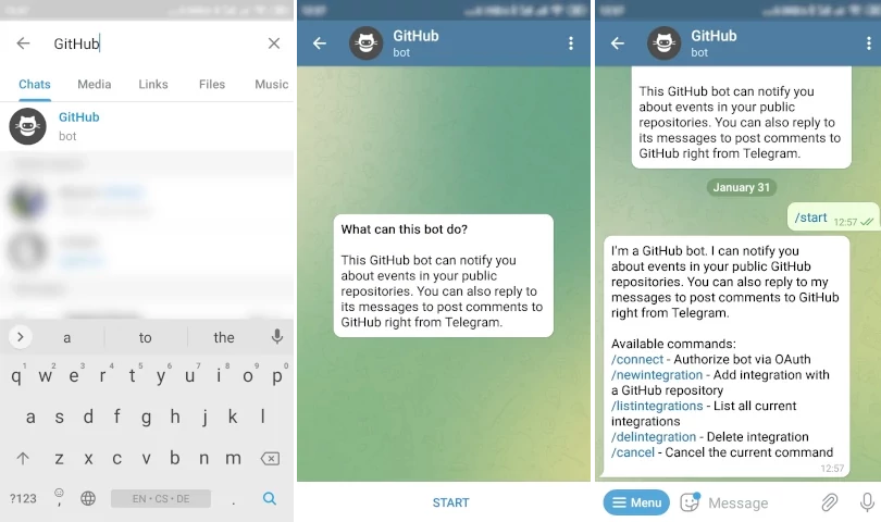 Telegramsi přidáme GitHub bot (@GitHubBot) - Spustíme bot,