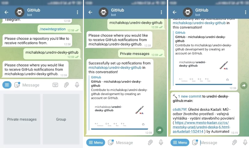Aplikaci Telegram lze nainstalovat jak na mobil, tak na klasický počítač. V několika intuitivních krocích, viz obrázky, si dokážeme připojit náš výše uvedený projekt na GitHubu. Celý proces pak netrvá ani 5 minut. Přidáme si nový kontakt - GitHub bot (@GitHubBot). Připojíme si projekt - a hotovo. Tím, že se spustí akce na GitHubu, tj. nová verze úřední desky se liší od předchozí, a proto se uloží, GitHub bot nás na tuto akci upozorní.