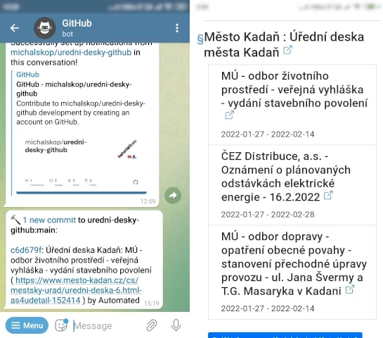 Telegram je chatovací služba. My využijeme toho, že umožňuje si snadno naprogramovat automatické boty, jeden z již existujících právě umí upozornit na novou změnu v projektu na GitHubu. Touto změnou bude pro nás novinka na strojově čitelné úřední desce.